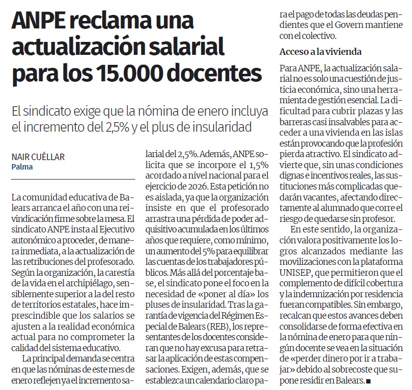 Després de reivindicar aquests últims anys les dificultats generades per la insularitat en relació amb la cobertura de places i accés a un habitatge, ANPE reclama al Govern que actualitzi les nòmines aquest mes de gener al 2,5%, i que afegeixi també l'1,5% acordat a escala nacional per al 2026. Des de ANPE fa temps que exigim una pujada salarial mínima d'un 5% a causa del poder adquisitiu perdut en aquests últims anys. Per això, demanem que s'apliquin immediatament les actualitzacions pendents, així com un calendari dels deutes pendents.