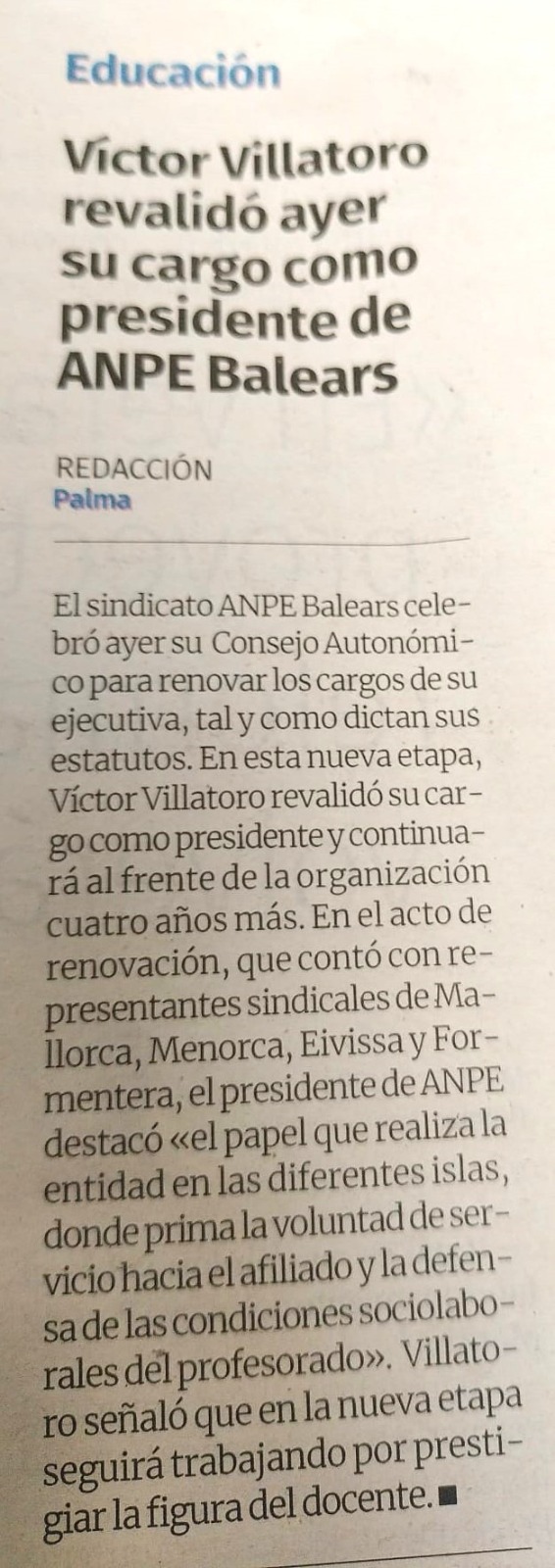 El sindicat ANPE Balears ha celebrat aquest dissabte el Consell Autonòmic per renovar els càrrecs de la seva executiva, tal com dicten els seus estatuts. En aquesta nova etapa, Víctor Villatoro revalida com a president i continuarà al capdavant de l'organització 4 anys més.